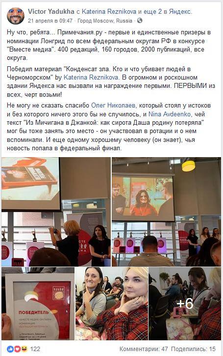 По ходу заметим, что в своей заметке о конкурсе на личной страничке Фейсбук Ядуха говорит следующее: “Не могу не сказать спасибо Олег Николаев, который стоял у истоков и без которого ничего этого бы не случилось, и Nina Avdeenko, чей текст “Из Мичигана в Джанкой: как сирота Даша родину потеряла” мог бы тоже занять это место – он участвовал в ротации и о нем вспоминали. И еще одному хорошему человеку (он знает), чья новость попала в федеральный финал.”