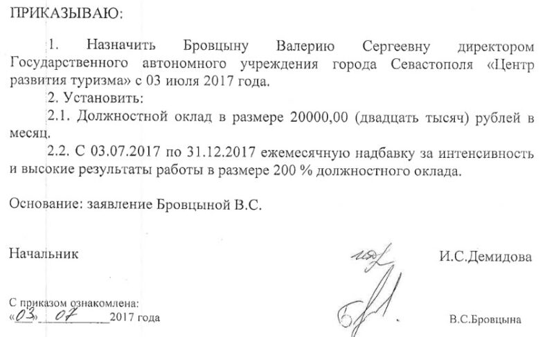Стоит отметить, что до назначения в Севастополь Бровцына на аналогичной должности за полтора года смогла освоить по госконтрактам всего 6 млн рублей. Но на новом месте она почему-то сразу получает «ежемесячную надбавку за интенсивность и высокие результаты работы в размере 200% должностного оклада», то есть ее зарплата составляет 60 тысяч рублей.