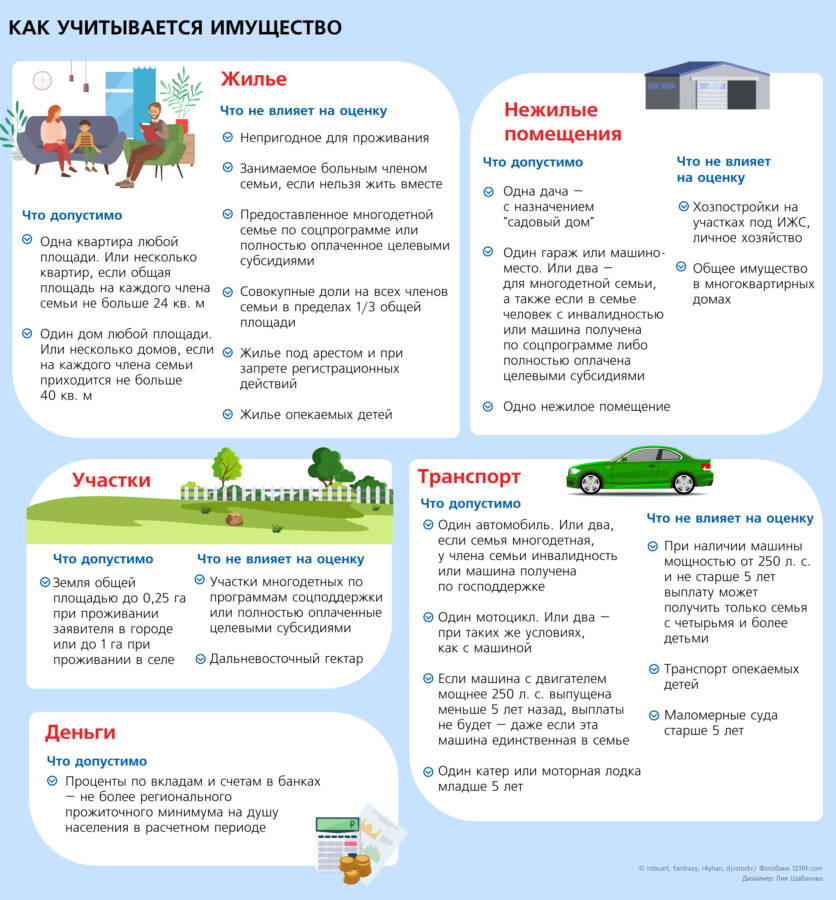 - собственность семьи (недвижимость, транспортные средства) должна соответствовать определенным ограничениям, предусмотренным нормативными правовыми актами.