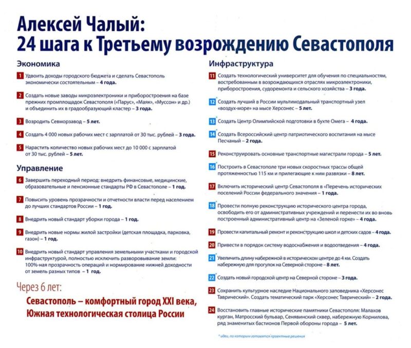 Согласно обещаниям, в которые поверили люди, к 2020 году “Севастополь – комфортный город XXI века, Южная технологическая столиц России.” Поскольку обещания чалистов в 5 лет не укладывались (и постоянно мешали губернаторы – прим. редакции), то им нужен еще 1 год для исполнения данных севастопольцам обещаний. Правда без Алексея Михайловича Чалого…