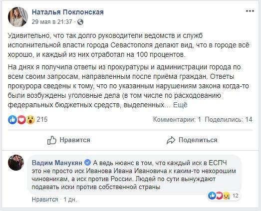 Получив ответы на запросы, отправленные в Правительство и прокуратуру города Севастополя, удивленная Наталья Поклонская отписалась на своей личной страничке в .