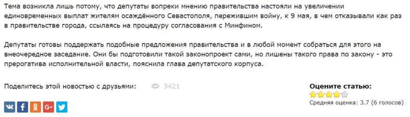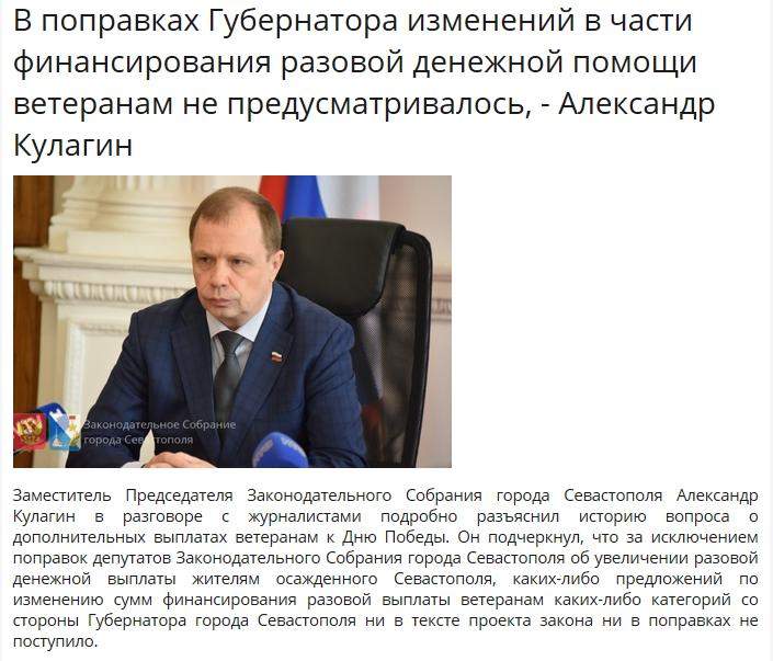 “Тема возникла лишь потому, что депутаты вопреки мнению правительства настояли на увеличении единовременных выплат жителям осаждённого Севастополя, пережившим войну, к 9 мая, в чем отказывали как раз в правительстве города, ссылаясь на процедуру согласования с Минфином.” – поясняет неизвестный.