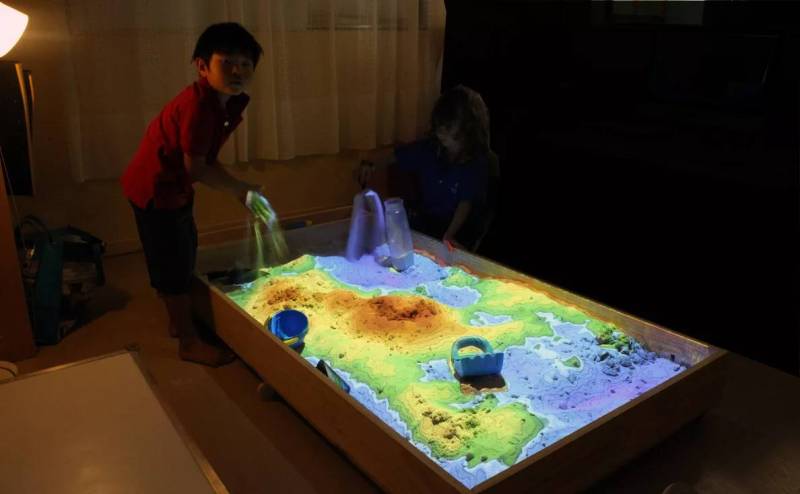 Интерактивная песочница – аттракцион, превращающий визуально горы из песка в настоящие. С помощью специального оборудования песок подсвечивается и создается реальная картинка.