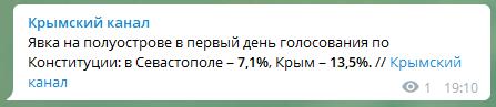 “Явка на полуострове в первый день голосования по Конституции: в Севастополе – 7,1%, Крым – 13,5%.” (?) Такие данные сообщает в Телеграм .