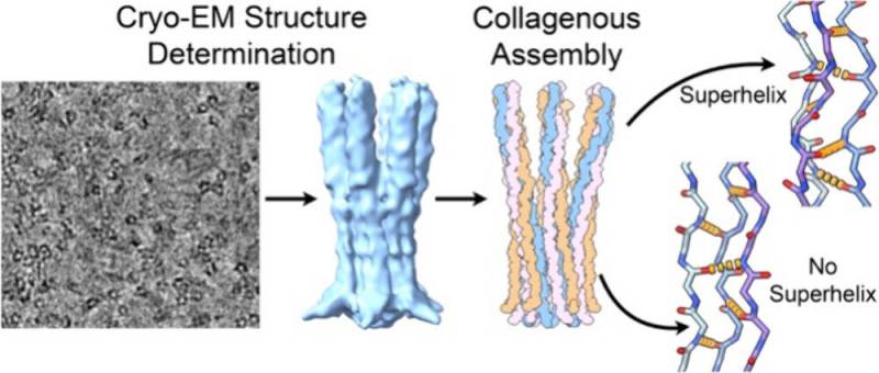 Исследователи использовали передовую криоэлектронную микроскопию (крио-ЭМ) для определения атомной структуры упакованной сборки коллагена, которая отличается от традиционно принятой правозакрученной суперспирали.