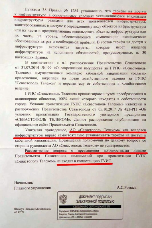 Также, на основании пересланного прокуратурой обращения, имеется ответ Главного управления информатизации и связи города Севастополя, в котором заявителю о преступлении сообщается, что: “что тарифы на доступ к инфраструктуре в сопоставимых условиях устанавливаются владельцем инфраструктуры равными для всех пользователей инфраструктуры, заинтересованных в доступе к определенному виду объектов инфраструктуры или их части и предполагающих использовать объекты инфраструктуры или их часть, на уровне, обеспечивающем компенсацию экономически обоснованных затрат и необходимой прибыли…