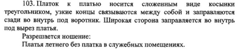 Что касается последней, не будем инсинуировать на , представленного в видео выше фотогеничного сотрудника, не первый год публично представляющего органы внутренних дел Российской Федерации в городе федерального значения Севастополе в прямом эфире государственной телекомпании. Однако заметим, что согласно Правилам ношения сотрудниками органов внутренних дел Российской Федерации форменной одежды, знаков различия и ведомственных знаков отличия, утвержденных Приказом МВД РФ от 26 июля 2013 г. N 575 г. (размещенном на сайте МВД РФ), п. 103. “Платок к платью носится сложенным в виде косынки треугольником, узкие концы связываются между собой и заправляются сзади во внутрь под воротник. Широкая сторона заправляется во внутрь под вырез платья.” Вместе с тем, “разрешается ношение платья летнего без платка в служебных помещениях.“