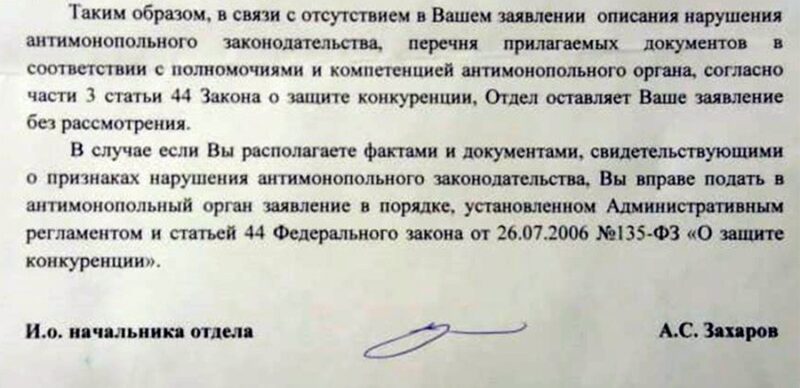Есть только отписка из ФАС на обращение, которое было сделано заявителем в прокуратуру, в связи с криминальным характером признаков возможных преступлений, которые ФАС не уполномочен и не стал рассматривать, по причине отсутствия описания нарушения антимонопольного законодательства.
