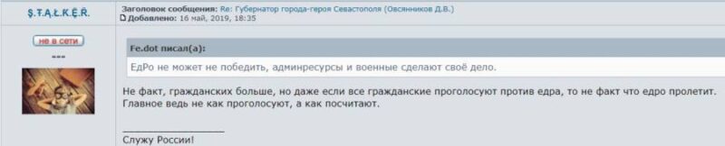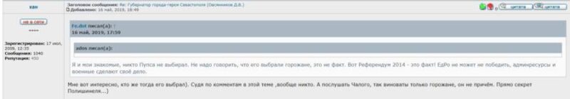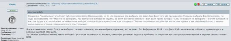 Fe.dot сообщил форумчанам, что “Я и мои знакомые, никто Пупса не выбирал. Не надо говорить, что его выбрали горожане, это не факт. Вот Референдум 2014 – это факт! ЕдРо не может не победить, админресурсы и военные сделают своё дело” – и предложил: “Может вообще отменить такие выборы? Пусть всех назначают из Москвы, какая фиг разница?”.