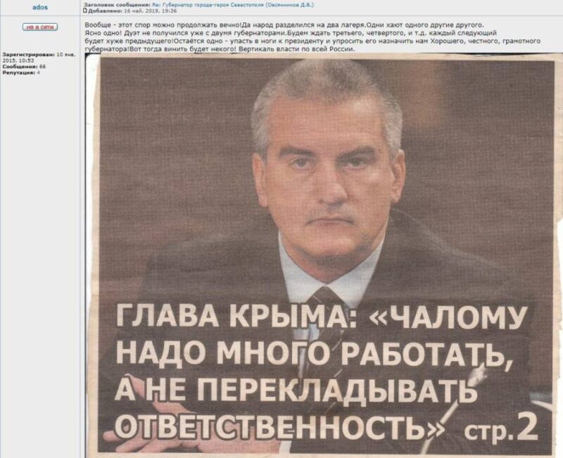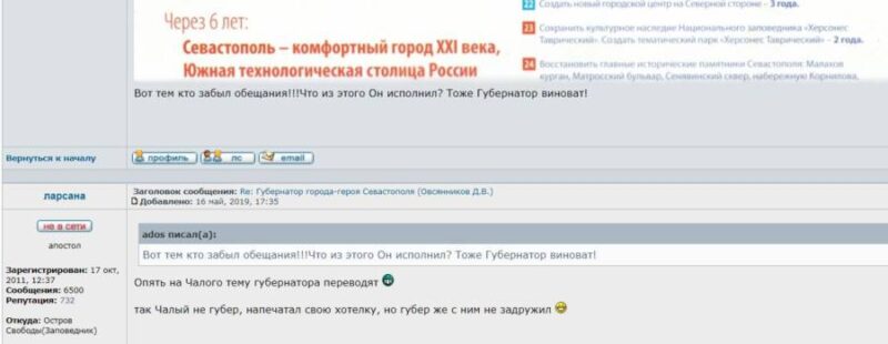 “Вот тем кто забыл обещания!!! Что из этого Он исполнил? Тоже Губернатор виноват!” – заявляет под брошюрой некто ados в ветке: “Губернатор города-героя Севастополя (Овсянников Д.В.)”