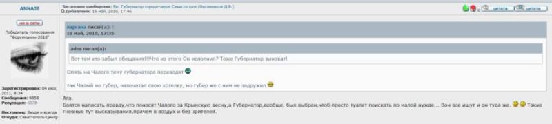 ANNA35 смело сказала, что “Чалого поносят за Крымскую весну”, “а Губернатор, вообще, был выбран, чтоб просто туалет поискать по малой нужде… Вон все ищут и он туда же…”
