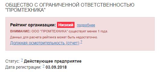 Согласно данным информационного портала “ЗА ЧЕСТНЫЙ БИЗНЕС” данное предприятие имеет низкий рейтинг, потому как зарегистрировано менее 1 года – 5 месяцев назад.