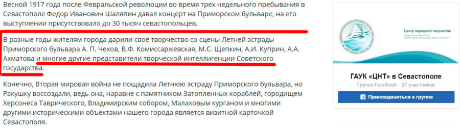 Государственное Автономное Учреждение культуры города Севастополя «Центр народного творчества», основанное в апреле 2016 года как «Агентство культуры и искусства» и переименованное в сентябре 2018 года в «Центр Народного Творчества» (, юр. адрес: Севастополь, бульвар Приморский, д. 15, Директор: Грязнов Александр Владимирович), на своем приводит некие исторические факты о культурной жизни нашего города, которые воспринимаются как не советующие действительности и вводящие читателей в заблуждение.