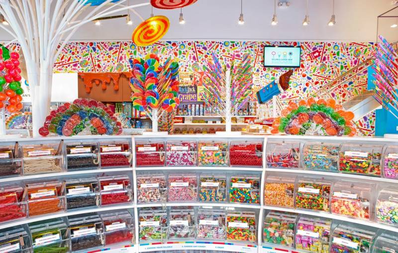 Внутри 170 больших диспансеров с различными видами драже. Бери кружку и набирай понравившееся цвета.