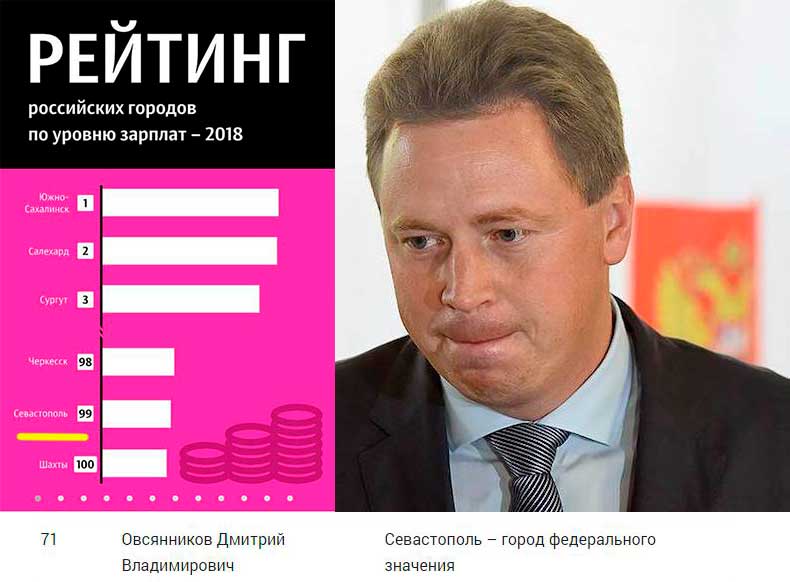 Правда нам и самим не понятно, почему при всех статистических заслугах Севастополя, его молодой и “перспективный” губернатор входит в ТОП 20 с конца, а не с начала списка , занимая 71 место из 85?