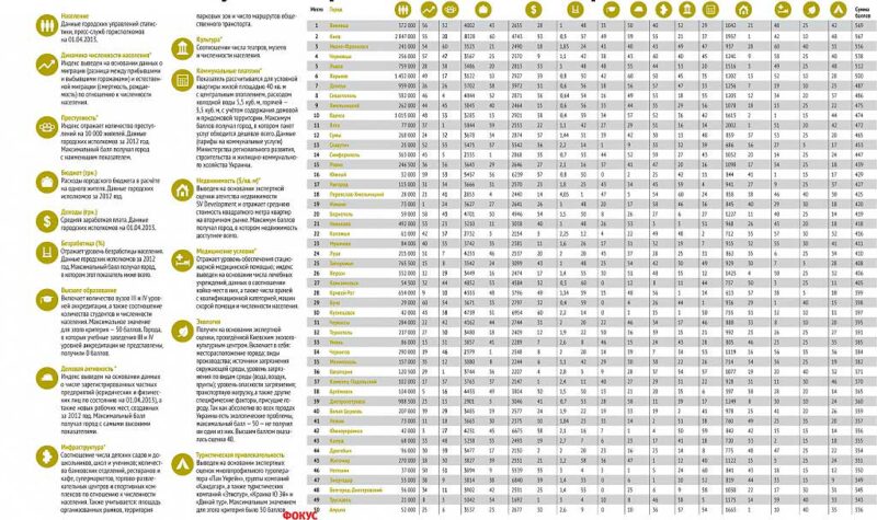 - стоимость жилищно-коммунальных услуг для условной квартиры площадью 40 кв.м (Максимальный бал получал город, где они ниже всего. Севастополь – 55, Симферополь – 45, Киев – 37)