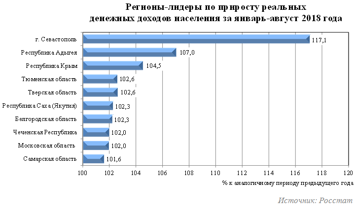 Другое дело, объективные данные Росстата, которые показывают, что реальные денежные доходы населения за январь-август 2018 года выросли в 22 субъектах РФ. Из них наиболее существенный рост зафиксирован в городе Севастополь (+17,1%).
