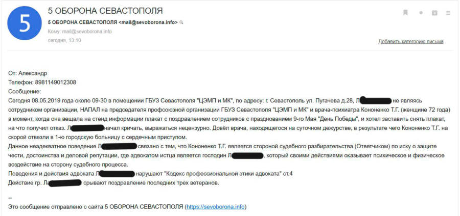 “Сегодня 08.05.2019 года около 09-30 в помещении ГБУЗ Севастополя “ЦЭМП и МК”, по адресу: г. Севастополь ул. Пугачева д.28, господин Л. (ФИО скрыто до окончания проверки, – прим. редакции), не являясь сотрудником организации, НАПАЛ на председателя профсоюзной организации ГБУЗ Севастополя “ЦЭМП и МК” и врача-психиатра Кононенко Т.Г. (женщине 72 года) в момент, когда она вещала на стенд информации плакат с поздравлением сотрудников с празднованием 9-го Мая “День Победы”, и хотел заставить снять плакат, на что получил отказ. Гр-н Л. начал кричать, выражаться нецензурно. Довёл врача, находящегося на суточном дежурстве, в результате чего Кононенко Т.Г. на скорой отвезли в 1-ю городскую больницу с сердечным приступом”.