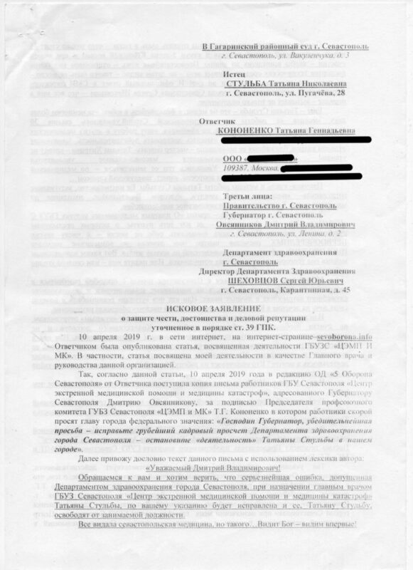 Вместе с тем, неоспоримым фактом в этой невероятной истории является то, что 5 июня состоится заседание суда по рассмотрению иска Главврач Центра экстренной медицинской помощи Татьяны Стульба на 5 млн. рублей о защите чести и достоинства к председателю Профкома Татьяне Кононенко, в связи с опубликованной на нее “5 Обороной Севастополя” жалобой губернатору Овсянникову.