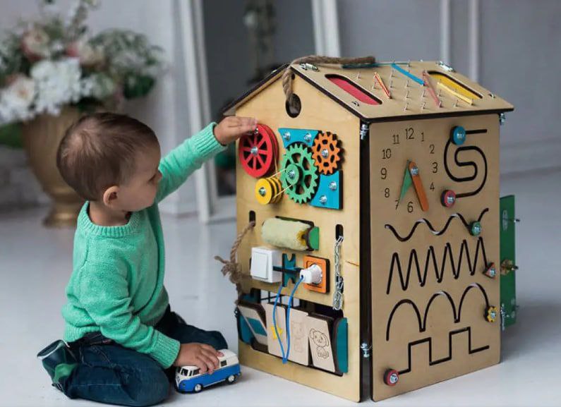 Бизиборды – это такие развлекательно-обучающие игрушки для детей от 1 до 5 лет, которые представляют собой доски, стенды или модули, на которых закреплены различные предметы, с которыми ребенок может взаимодействовать (крутить, стучать, открывать, завязывать/развязывать, включать/выключать и так далее).