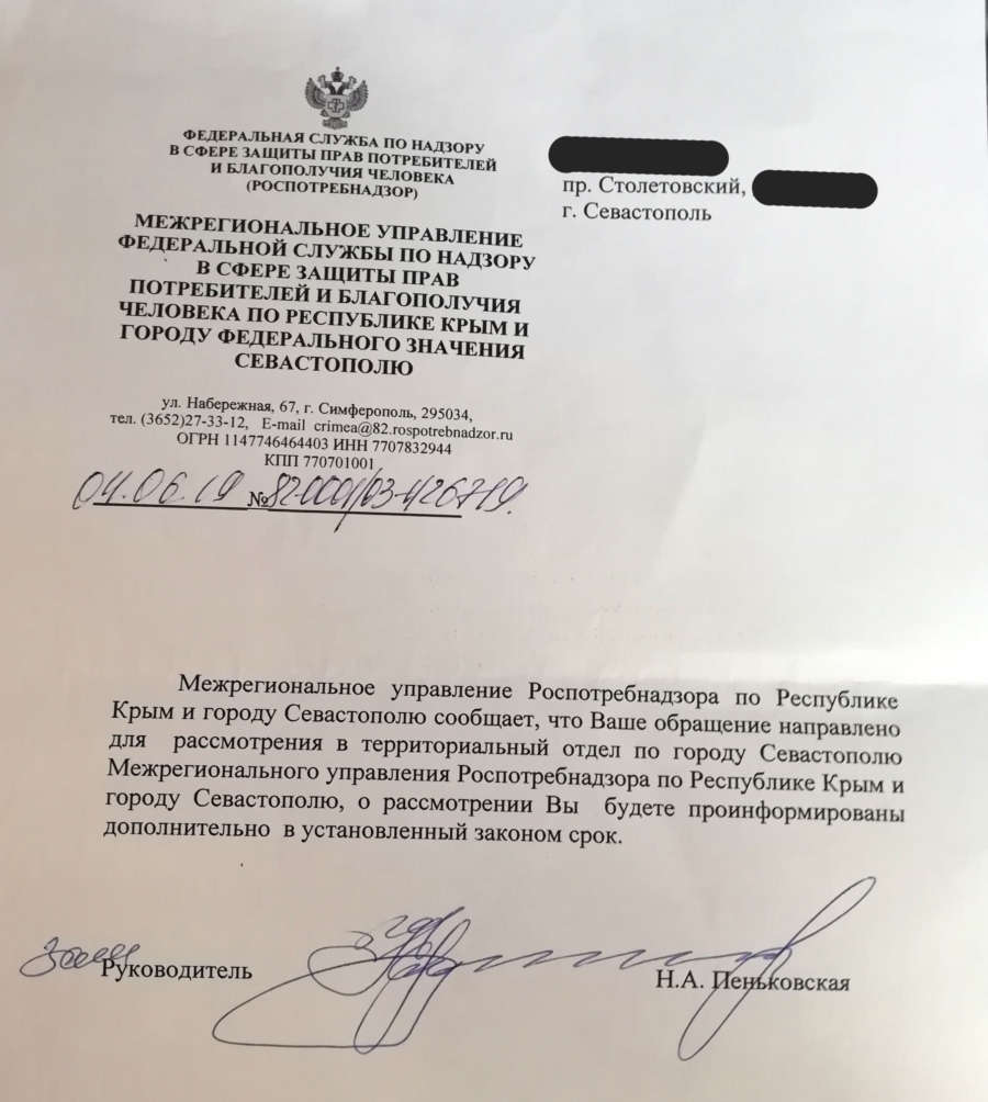 Ниже, приводим текст официального обращения жильцом домов по проспекту Столетовскому и ул. Колобова, направленного в конце мая: Губернатору г. Севастополя Овсянникову Д.В., Директору Департамента городского хозяйства г. Севастополя Тарасову М.А., Начальнику Главного управления потребительского рынка и лицензирования Кирпичникову В. М., Руководителю межрегиональным управлением Роспотребнадзора по РК и городу Севастополю Пеньковской Н. А., Прокурору г. Севастополя Большедворскому М. А.: