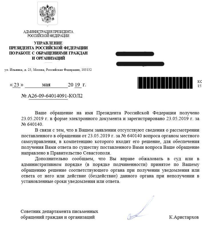 Очевидно, не доверяющие ни одному органу местной власти севастопольцы не постеснялись по данному пустяковому вопросу побеспокоить даже администрацию Президента РФ, На что получили резонное вразумление: “В связи с тем, что в Вашем заявлении отсутствуют сведения о рассмотрении поставленного в обращении от 23.05.2019 г. за № 640140 вопроса органом местного самоуправления, в компетенцию которого входит его решение, для обеспечения получения Вами ответа по существу поставленного Вами вопроса Ваше обращение направлено в Правительство Севастополя.”