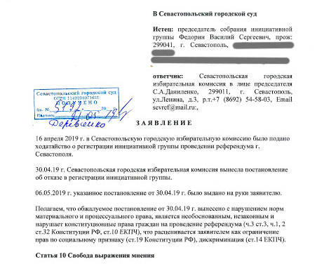 Инициативная группа севастопольских общественников, выступающих за проведение референдума о выражении недоверия губернатору Овсянникову, подала 21 мая заявление в Городской суд, в котором просит отменить как незаконное и необоснованное постановление севастопольской городской избирательной комиссии №243/1297-1 от 30.04.2019 года и внести судебный акт об удовлетворении ходатайства и о регистрации инициативной группы по проведению референдума города Севастополя с вопросами, вынесенными на референдум.