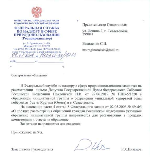 Заявителю направляется для сведения”, – говорится в ответе Заместителя Руководителя Федеральной службы по надзору в сфере природопользования Р.Х. Низамова на обращение депутата Госдумы и севастопольских общественников, направленного для рассмотрения и дачи ответа по сути Правительству Севастополя.