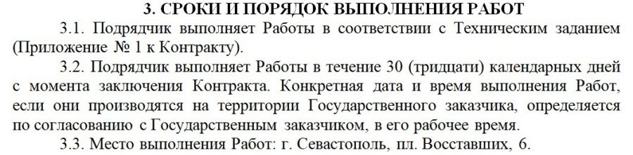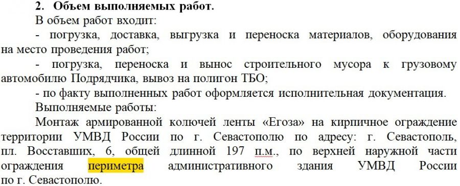 Как видно на скрине выше, согласно пункту 1.1. проекта контракта, “Подрядчик обязуется выполнить работы по монтажу армированной колючей ленты «Егоза» на кирпичное ограждение территории УМВД России по г. Севастополю по адресу: г. Севастополь, пл. Восставших, 6 в соответствие с условиями Технического задания (Приложение №1 к Контракту).”