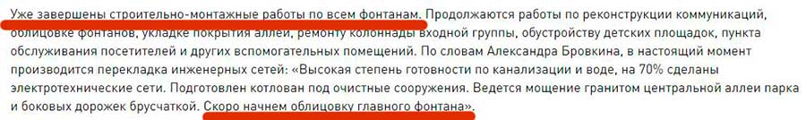 На данный момент, утверждение о том, что “уже завершены строительно-монтажные работы по всем фонтанам”, мягко говоря, не соответствует истине.