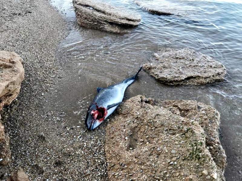 Сегодня утром, в том же месте на пляже, около лестницы был обнаружен свежий, окровавленный труп еще одного мертвого дельфина. Судя по характеру ран, несчастное животное порезалось о сети, протянутые недалеко от берега.