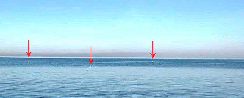 Неразборчиво, но все же, на фотографии видны поплавки сетей, расставленных браконьерами невдалеке от берега. Это полиэтиленовые бутылки с воздухом.