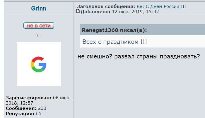 Стоит отметить, что всего в праздничный день в данной ветке было опубликовано только 5 сообщений, включая вышеприведенное и реплику: