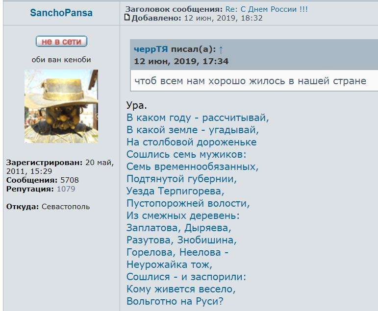 Чтобы это значило? В ветке Севастопольского форума “С Днем России!!!!” на праздник процитировали пролог из произведения Н.А. Некрасова :