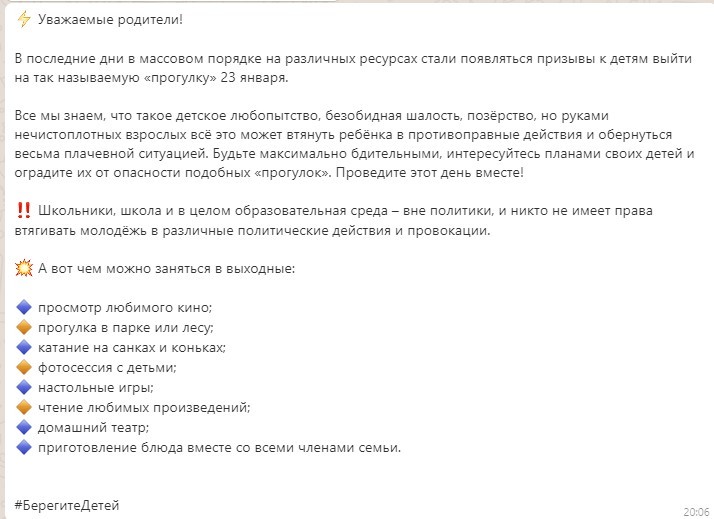 В последние дни в массовом порядке на различных ресурсах стали появляться призывы к детям выйти на так называемую «прогулку» 23 января.