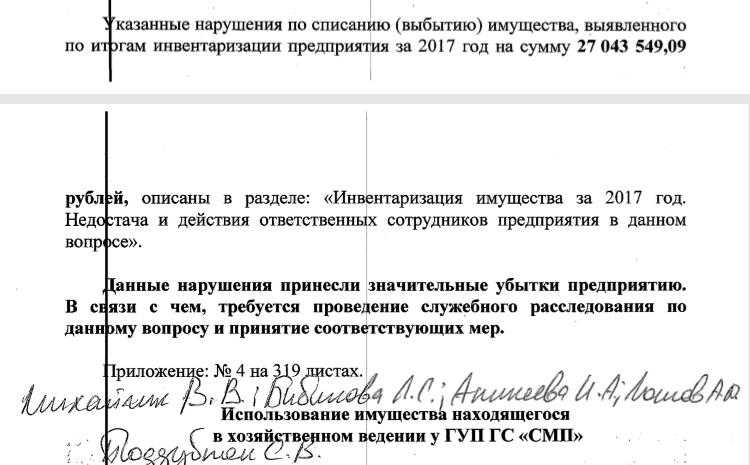 Не проведена работа по вопросу выявленной Центральной инвентаризационной комиссией недостачи и имущества ГКП ГС 2СМП» на сумму 27 043 549.09 рублей.