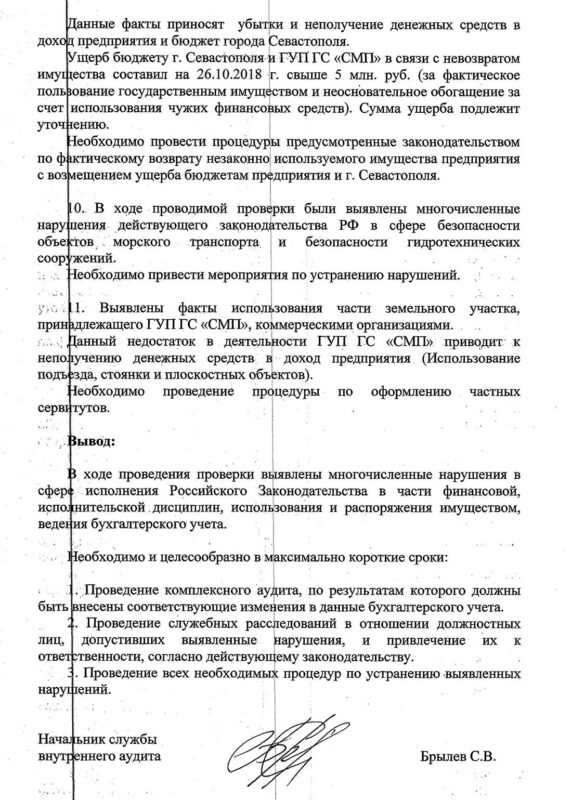 Для читателей, которые предпочитают делать собственные выводы, основанные на фактах, приводим полный текст Акта от 18.12.2018 г. (с приложениями) об использовании имущества ГУП ГС СМП (Севастопольский морской порт), подписанный начальником службы внутреннего аудита Брылёвым С.В. и заверенный резолюцией и. о. генерального директора ГУПГС «СМП» И.М. Чистяковым.