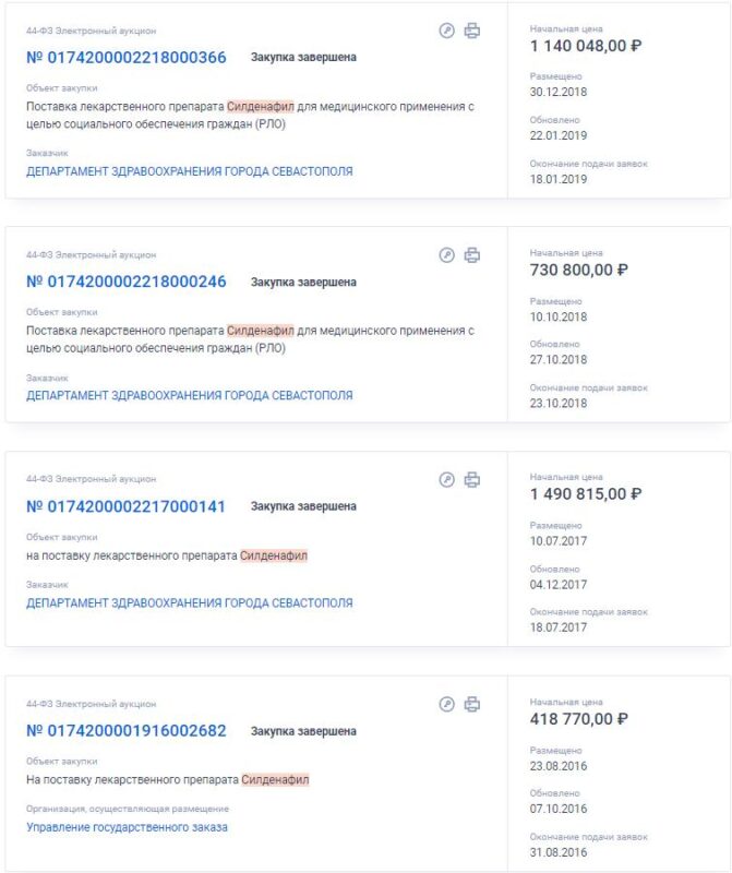 На электронной площадке zakupki.gov.ru нам удалось найти четыре объявления о госзакупках на поставку лекарственного препарата Силденафил в Севастополе с 2016 по 2018 год на сумму 3 780 433 рубля.