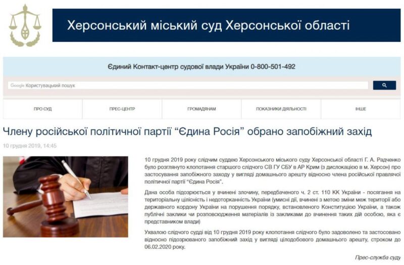 “10 декабря 2019 следственным судьей Херсонского городского суда Херсонской области Г. А. Радченко было рассмотрено ходатайство старшего следователя СО ГУ СБУ в АР Крым (с дислокацией в г. Херсон.) О применении меры пресечения в виде домашнего ареста в отношении члена российской правящей политической партии ” Единая Россия “.