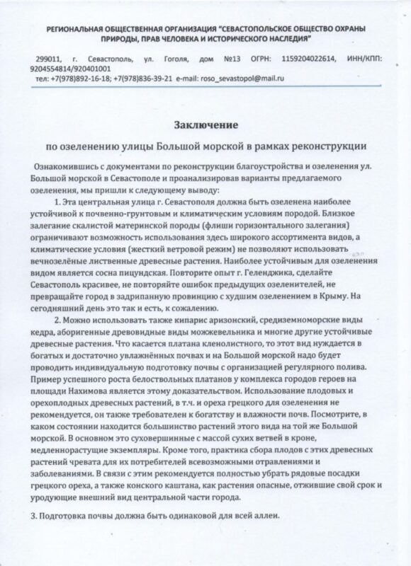 В документе значится, что все выводы, в том числе «полностью убрать рядовые посадки грецкого ореха, а также конского каштана» сделаны, цитата: «Ознакомившись с документами по реконструкции благоустройства и озеленения улицы Большой морской в Севастополе и проанализировав варианты предлагаемого озеленения (прим. ред – орфография документа сохранена)».